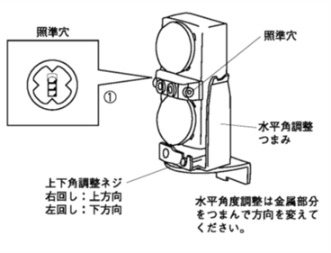 センサー真ん中の横にある「照準穴」を覗き、中央にリフレクターの中心が見える様に、水平・垂直を調整して下さい。
