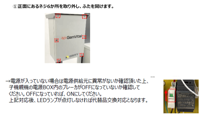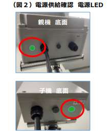 親機および子機のボックス底面のLEDランプを確認の上、点灯していない場合はボックス内のブレーカーがOFFになっていないかを確認してください。OFFになっている場合は、ONに切り替えてください。また、ブレーカーがONの状態にもかかわらずLEDが点灯しない場合は、代替機を手配いたしますので弊社担当営業までご連絡ください。