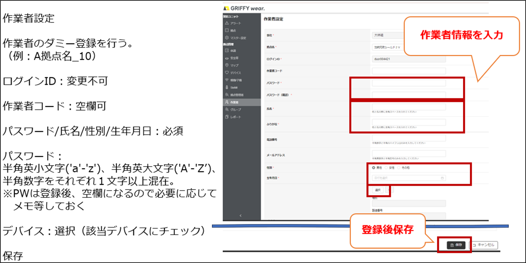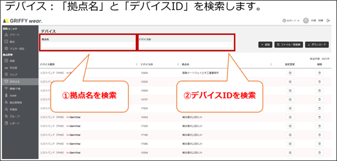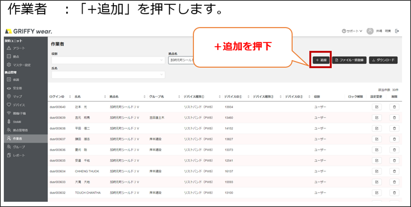 ゲンバイタル(BLE)で作業者名を削除してしまった。再度デバイスIDと紐づけはできますか? 削除されたログインIDは再利用できませんので、新たにログインIDを追加して設定を行う必要があります。 削除されたログインIDは再利用できませんので、新たにログインIDを追加して設定を行う必要があります。 ※管理画面(GRIFFY wear.)より「作業員」から「+追加」より設定可能 ゲンバイタルで作業者情報の変更はできますか?