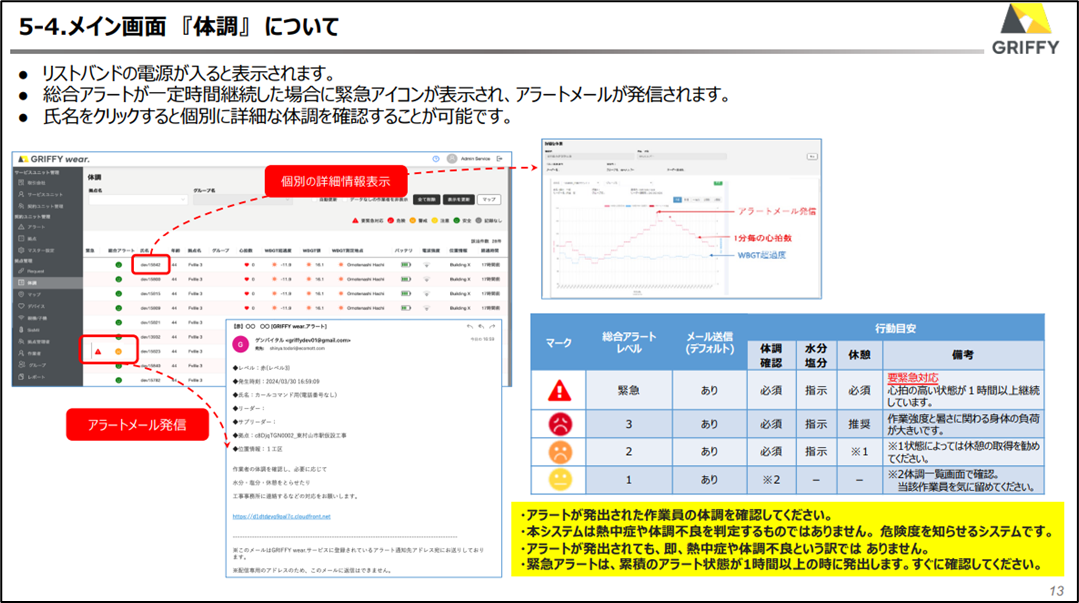 ※緊急アラートのレベルや発動時間は、設定により変更可能です。現場で頻繁に緊急アラートが発生する場合は、適宜設定を見直してください。アラート発出時の具体的な対応方法については、ユーザーマニュアルP13を参照してください。