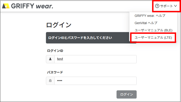 ゲンバイタル(LTE)のユーザーマニュアルはどこにありますか。 GRIFFY wear. のログイン画面より、右上「サポート」からダウンロード可能です。 GRIFFY wear. のログイン画面より、右上「サポート」からダウンロード可能です。