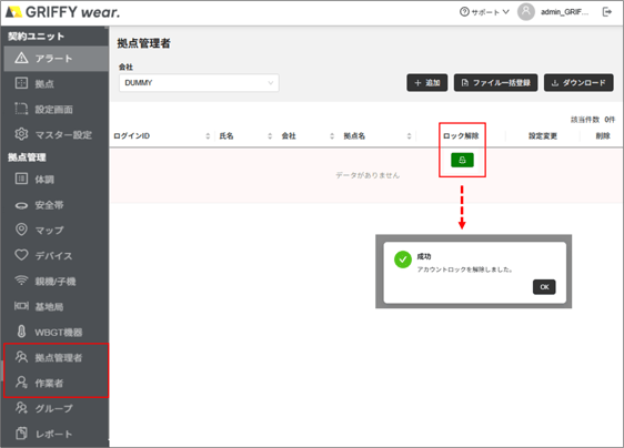 ①管理画面(GRIFFYwear.)にログイン後、「拠点管理者」または「作業者」を選択。