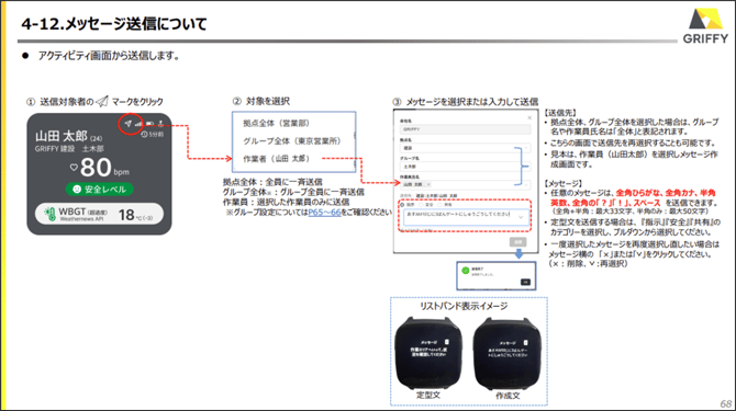 管理者が定型文や任意のメッセージをリストバンド(デバイス)に送信し、装着者が音と振動でメッセージを受け、内容の確認ができます。
