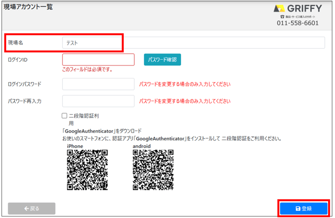 1.「現場アカウント管理」から変更を希望する現場名を選択し、「編集」をクリック、新しい現場名を入力後、「登録」します。