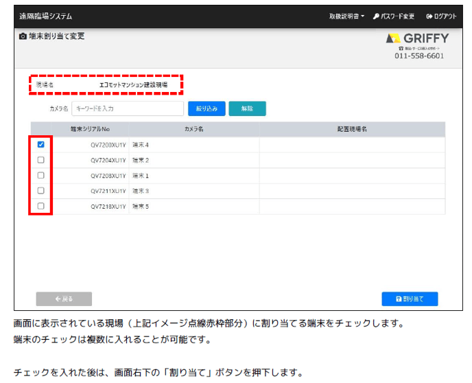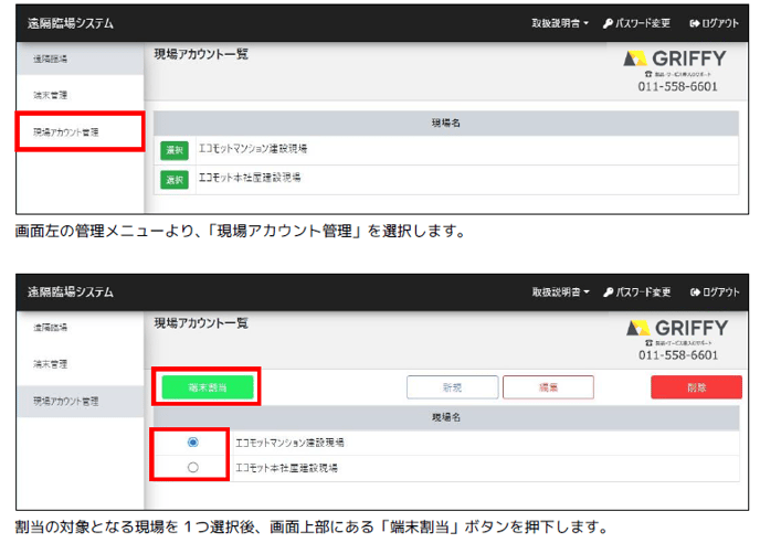 現場アカウントを追加したがGリポートが表示されない PC側の遠隔臨場システム画面からGリポートの「端末割当」を行ってください PC側の遠隔臨場システム画面からGリポートの「端末割当」をご確認ください。 新たに作成した現場名に対して、「現場アカウント管理」から現場名と端末を割当てる必要がございます。 ※管理者マニュアルP9、P10「2.3. 現場に端末を割り当てる 」参照。